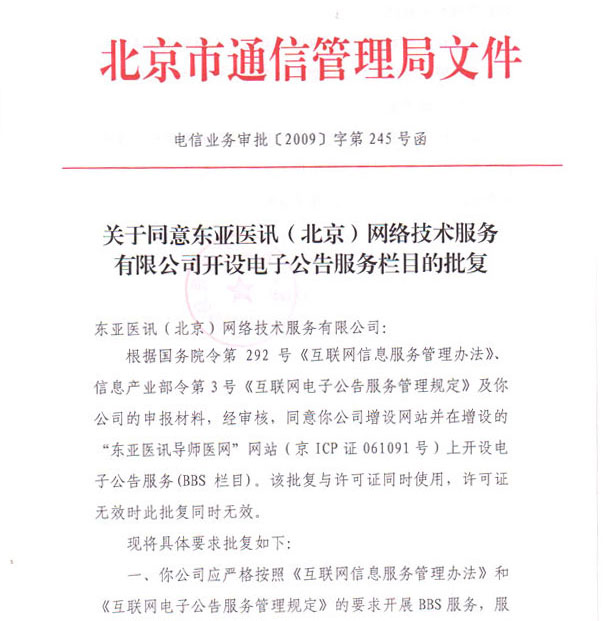 北京市通信管理局同意東亞醫訊(北京)網絡技術服務有限公司開設電子公告服務欄目